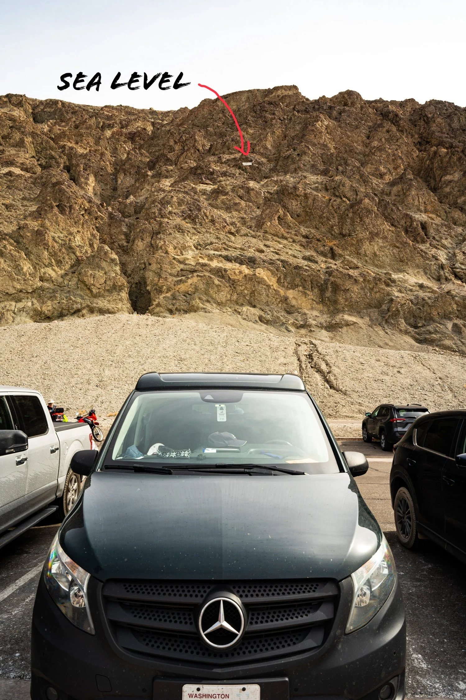 Zabriskie Point is number three on the National Park Service Must-See Locations and is also on their do-not-miss list. They suggest taking photos at sunrise and sunset, so after we secured a “campsite” in another gravel parking lot, we headed up there. The geological formations and views are spectacular, but the sunset that day was a real dud.